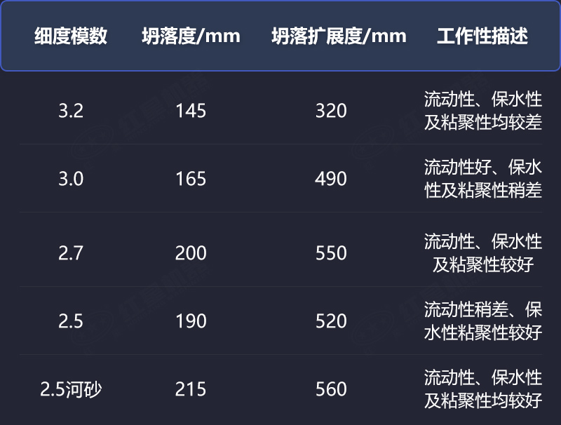 2、機制砂細(xì)度模數(shù)大于3.0時,新拌機制砂混凝土和易性差,易出現(xiàn)離析、泌漿及包裹性差等風(fēng)險,細(xì)度模數(shù)小于2.7時,混凝土的流動性降低。