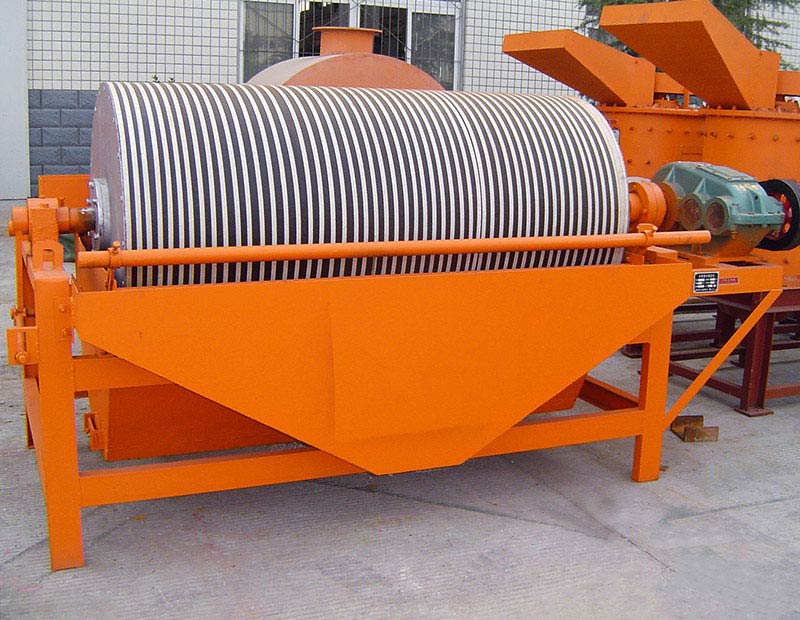 物料經(jīng)過圓鋼篩進(jìn)入料倉,大泥塊廢毛石(鵝卵石)由頂部圓鋼篩篩出,。入料倉下部裝有振動(dòng)給料機(jī),振動(dòng)給料機(jī)將原礦物料均勻撒布到磁滾筒表面,強(qiáng)磁性物料由于受到磁力作用較大,吸附在磁滾筒表面,鐵粉顆粒在磁滾表面飛速翻滾,隨滾筒旋轉(zhuǎn)帶到分礦漏斗之精礦口,落入皮帶機(jī)輸送到右方,弱磁性尾砂(河砂)由于慣性作用而向前拋出,從而達(dá)到分選的目的。
