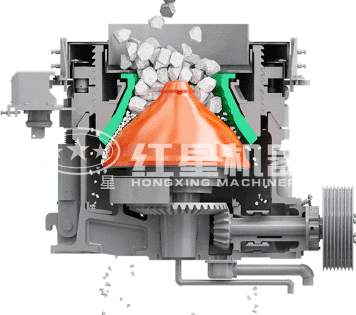 液壓圓錐破碎機(jī)工作時(shí),偏心軸上的動(dòng)錐在電動(dòng)機(jī)的帶動(dòng)下不停地周期性的擺動(dòng),使得動(dòng)錐和靜態(tài)錐之間的距離不斷的發(fā)生變化,物料從進(jìn)料口進(jìn)入破碎腔后受到動(dòng)錐和靜錐的擠壓后破碎,經(jīng)過(guò)多次的擠壓破碎達(dá)到要求粒度后從出料口排出。